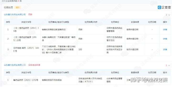 特康药业集团的实际控制人唐永斋控制的公司多次被罚。据企查查显示,康力生药业有限公司曾在2014年因销售劣药骨肽注射液等药品被日照市食品药品监督管理局罚款,2015年因销售劣药“天麻素注射液”等药品多次被被日照市食品药品监督管理局罚款,2021年因销售的药品不符合规定被山东省药品监督管理局罚款。