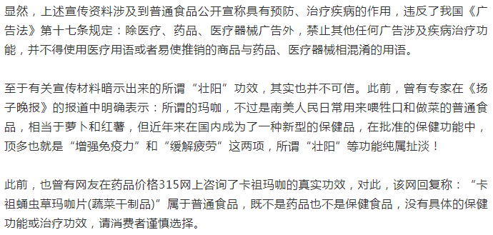 该产品所含有的“玛咖”成分也被包装出了“增强免疫力”、“改善睡眠”等保健功效,以及“让心血管疾病得到保护”、“改善前列腺”等医疗作用。