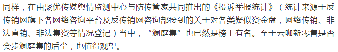 眼下,在腾讯灵鲲金融风险监管平台上,“澜庭集”这个关键词已经被标记了5044次,虽然标记类型是“暂未发现定性的相关报道”,但其主要标签有“发展下线拉人头”的字样。