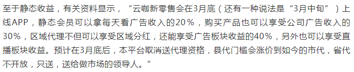 至于致力于打造全国最大农商电商平台的云咖新零售在今后会如何发展?围绕着相关产品出现的虚假宣传等问题,能否得到经营主体的反省与整改?当时间来到3月中下旬,云咖新零售的APP是否会如期上线?对此,本网将继续保持关注。