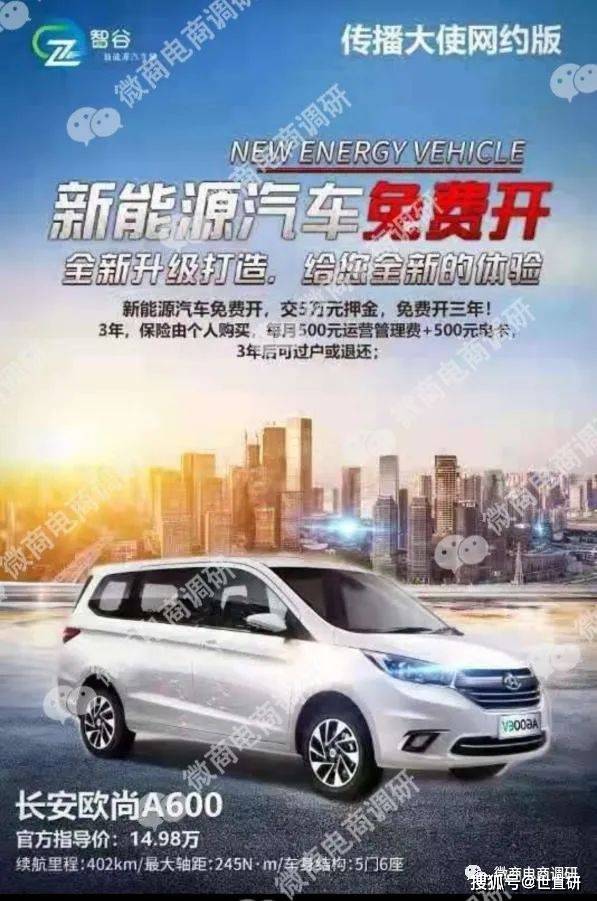 一个叫智谷新能源集团的公司,建立了一个新能源汽车产业园,专门给想购入新能源汽车的人免费开。其代理称,只需要交5万元押金,每个月缴纳500元运营管理费和500元电卡,就可以免费开走一辆新能源汽车,该车可以免费开3年,3年后可以过户或者退还。