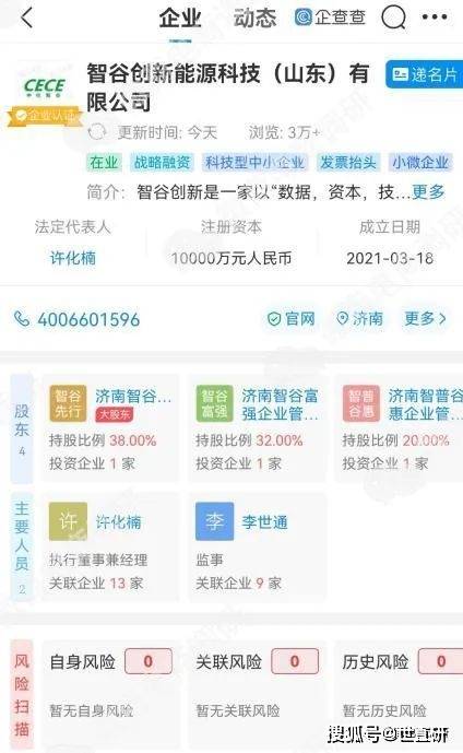 经查,智谷创新新能源科技(山东)有限公司成立于2021年3月18日,法定代表人为许化楠,监事李世通,注册资本为1亿元,企业地址位于山东省济南市莱芜区,所属行业是批发业,经营项目是电力行业高效节能技术研发;电动汽车充电基础设施运营等。