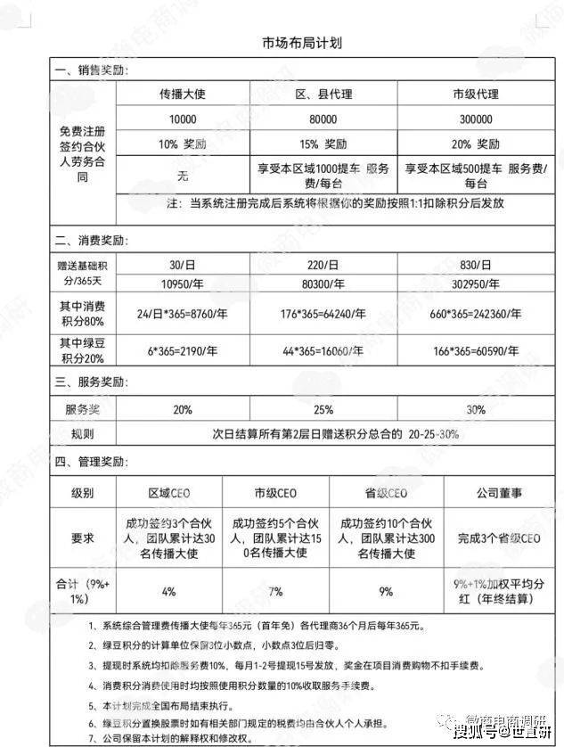 据了解,成为智谷新能源汽车的传播大使后,具有这些福利:可以获得一万元购车券,三年内可任选车型购买车,还可以获得2190绿豆积分来兑换股票,并且每个区域都配备了相应名额试乘车辆,免费开车,最后还能获得推广奖励,边开边赚钱。其商城即绿豆之家利用每天积分赠送优势,来增加粘性和活跃度。利用晋升区县级合伙人的机制在区域内实现被动稳增收益。市级股东合伙人可以开设5GMR/VR新能源汽车体验馆。从而形成了线上线下相结合,用点切入,积分链接的基本模式。