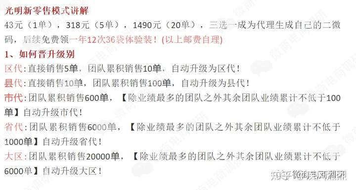 据知情人阿强(化名)介绍,唯奕贝的前身其实是光明新零售,原来的光明新零售是6级代理,现在的唯奕贝经过调整后已经变成了3级。据此前光明新零售推广人员发布的资料解析显示,原制度详情如下: