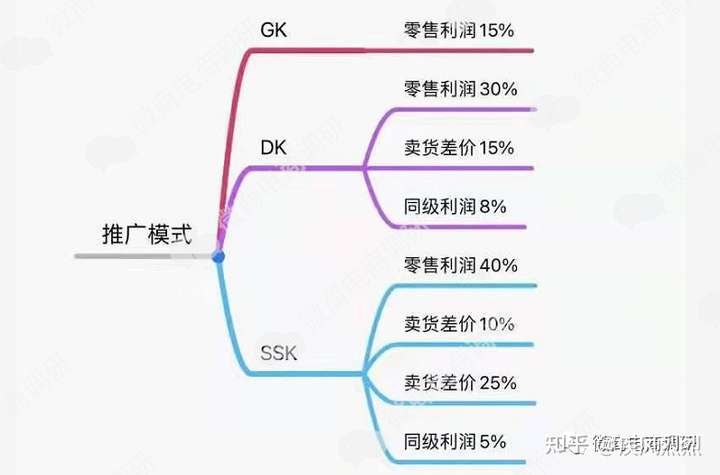 不同级别对应的权益自然不同,GK的零售利润(也叫直推利润)为15%;钻石享受三种收益,即零售利润30%、卖货差价15%、同级利润8%;SSK享有四种收益,零售利润40%、差价收益(相对于DK的差价是10%,相对于GK的差价是25%)、同级利润5%,还有月度总业绩分红,也就是团队业绩返点。据知情人透露,SSK的团队业绩在20万以内,返点为3%;20万到50万之间,返点为4%;20万到100万之间,返点是5%;100万到150万之间,返点是6%;150万到200万之间,返点就是7%;再往后推,业绩达到1000万元,返点为10%;在1000万到2000万以内,返点为10.5%;在2000万到3000万以内,返点是11%。推广人员还介绍称,等团队业绩达到了3000万以上,返点还会更高,按照他的说法,业绩返点这项收益其实是“到达制”的。