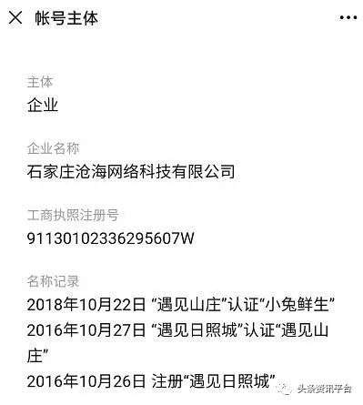 说到沧海网络公司,自然不得不提到该公司认证的公众号,而这个公众号已经连续更改过了好几次名字,原来叫“遇见日照城”,后来叫“遇见山庄”,最后改为“小兔鲜生”,在2019年6月(也就是孙伟退出沧海网络公司的当月)之后,该公众号便不再更新。