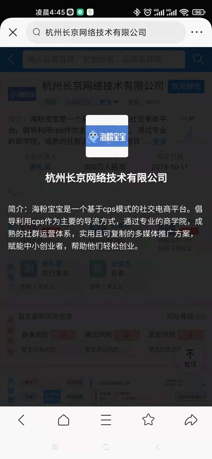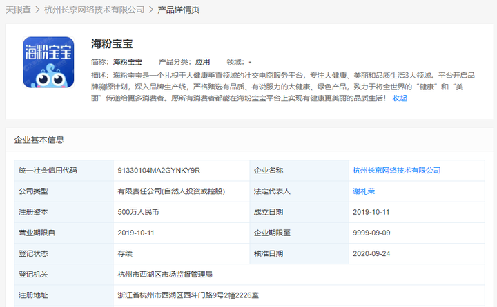 网上查询,海粉宝宝的运营主体是杭州长京网络技术有限公司,成立于2019年10月11日,注册地位于浙江省杭州市西湖区西斗门路9号2幢2226室,法定代表人为谢礼荣。经营范围包括一般项目:计算机系统服务;物联网技术服务;信息系统集成服务;网络技术服务;广告设计、代理;专业设计服务;平面设计;企业形象策划;市场营销策划;礼仪服务;项目策划与公关服务;互联网销售(除销售需要许可的商品);针纺织品及原料销售;服装服饰零售;鞋帽零售;厨具卫具及日用杂品零售;文具用品零售;体育用品及器材零售;珠宝首饰零售;乐器零售;照相器材及望远镜零售;计算机软硬件及辅助设备零售;宠物食品及用品零售;电子元器件零售;五金产品零售;化妆品零售;摄影扩印服务;工艺美术品及收藏品零售(象牙及其制品除外);技术服务、技术开发、技术咨询、技术交流、技术转让、技术推广;第一类医疗器械销售;通讯设备销售;电子产品销售;家用电器销售;玩具销售;皮革制品销售;母婴用品销售;日用百货销售;食用农产品零售;第二类医疗器械销售;汽车零配件零售;家居用品销售;汽车装饰用品销售(除依法须经批准的项目外,凭营业执照依法自主开展经营活动)。许可项目:食品经营;出版物零售;第二类增值电信业务;技术进出口;货物进出口(依法须经批准的项目,经相关部门批准后方可开展经营活动,具体经营项目以审批结果为准)。杭州长京网络技术有限公司对外投资1家公司。