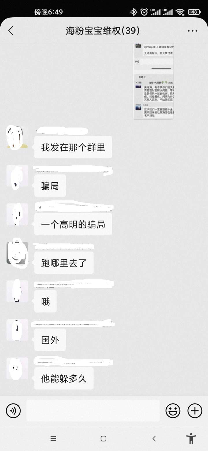 海粉宝宝涉案巨大,涉及区域众多,影响很差,因为去年很多微信群给解散了,所以没有联系到更多的受害者,这都是每个人的血汗钱,怎么能说没就没了呢!现在我们已经联系上了40多位受害者,一直在想办法维护我们的合法权益,但是现在因为疫情原因,一直不能组织去杭州海粉公司,望有能力,有大爱的人主持正义帮帮我们吧,非常感谢!
