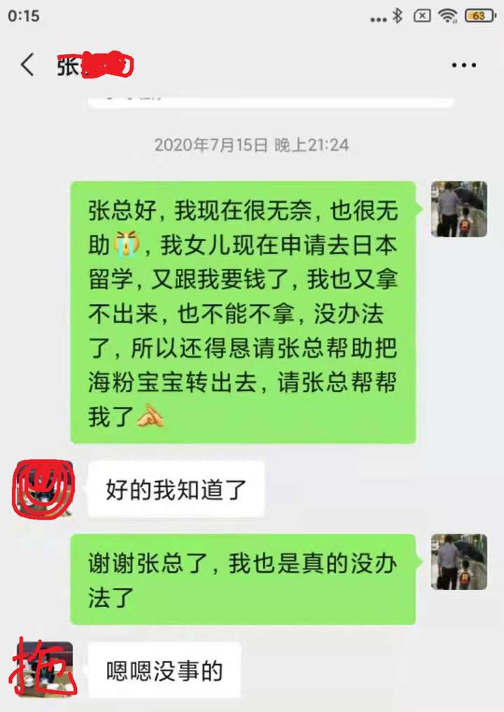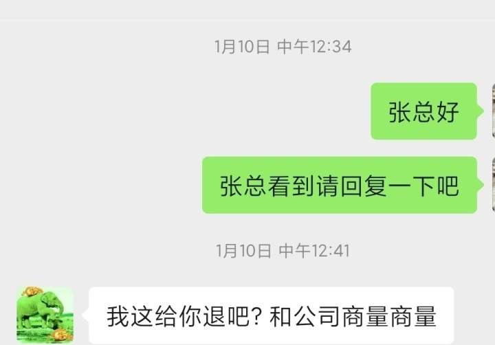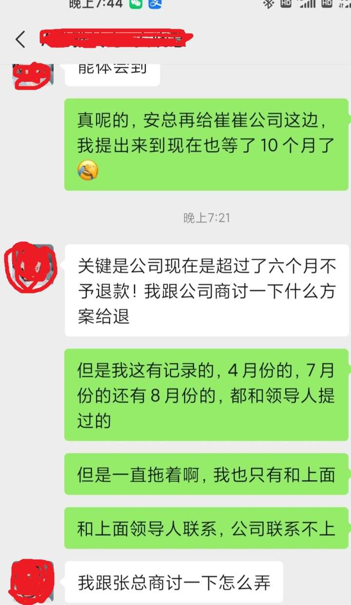 6月份时,我发现不太对,所以给我上线提出退费的要求,我上线又找了张爱玲,张爱玲回复现在退费要扣除20%,不合算,代理费还要涨到8万,不如有加入的给我转出去,就这样一次次拖,后来我要求即便扣费我也要退,张爱玲这边又说给联系公司,和公司商讨退费的事!期间我又联系安晓惠,她答复说她和张爱玲一起找公司谈,这样拖来拖去。我打听到公司负责人高高的联系方式,高高也是一个劲拖,到最后回复说退费超过6个月不给退了。