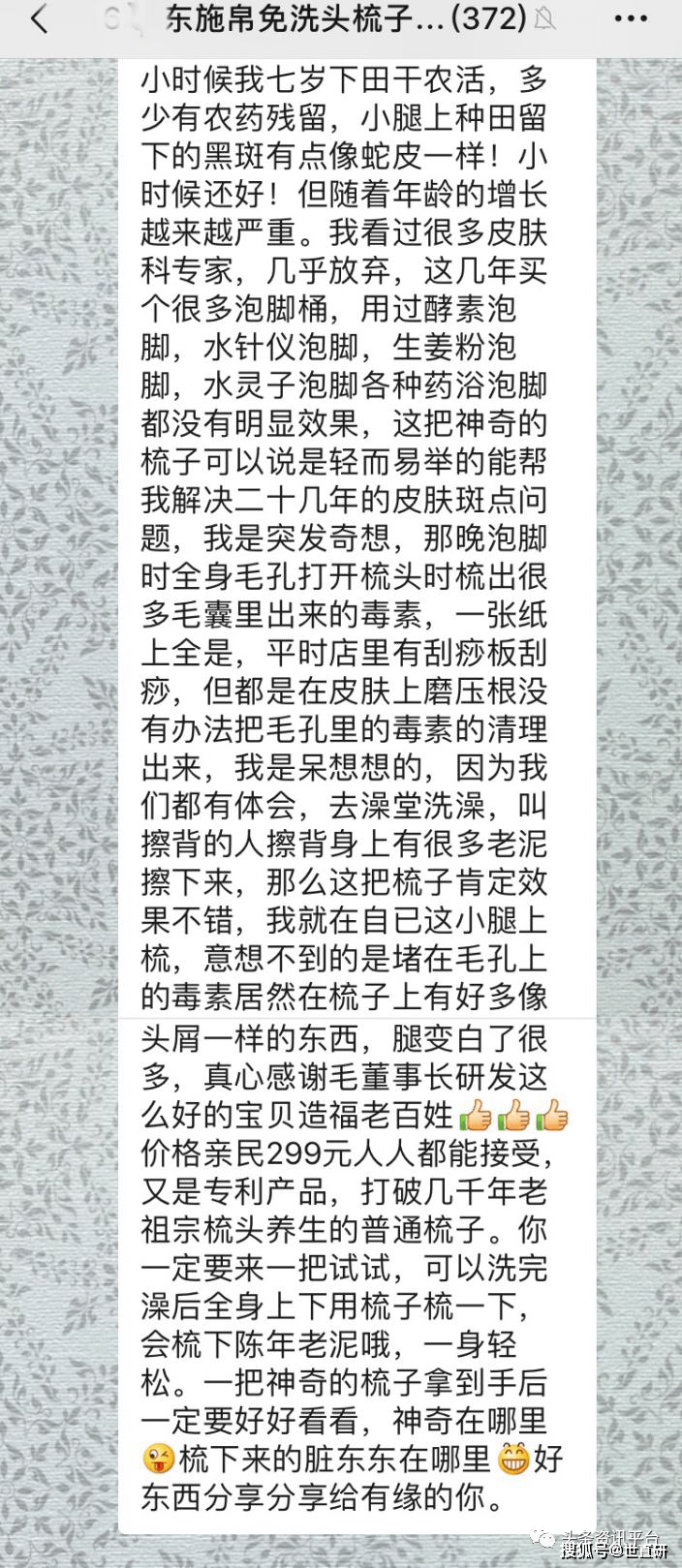 除此之外,还有许多在治疗皮肤病、面瘫、尿毒症、脑梗患者方面的案例:患者从小因农药残留留在小腿上的黑斑,随着年龄增长越来越严重,看过很多皮肤科专家,买过泡脚桶用酵素、水针仪、生姜粉、水灵子等各种药浴泡脚都没有明显效果,随后在泡脚时用东施帛的梳子梳头便梳出来很多毒素,甚至在小腿上用梳子梳出许多像头屑一样的东西,腿也变白了许多。