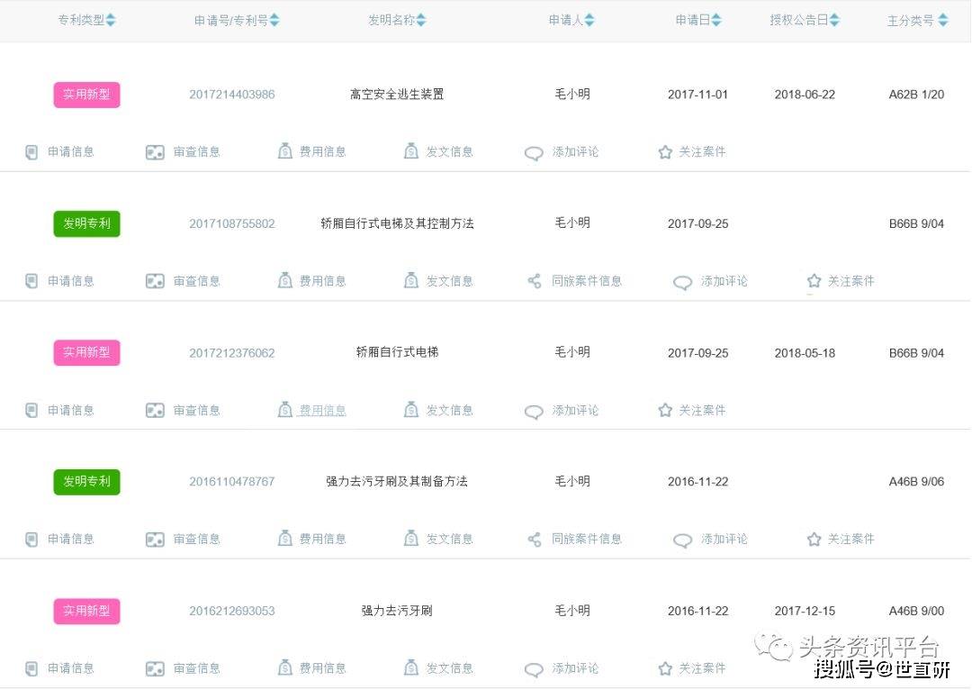 说到免洗梳子的发明人毛小明,眼下还担任了奇建(杭州)电梯科技有限公司、尚新坞(厦门)科技有限公司(目前已注销)的法人代表,以及宝梳(厦门)科技股份有限公司的股东。而他本人也是发明诸多,除了免洗梳子,还拥有高空安全逃生装置、强力去污牙刷、轿厢自行式电梯等多项发明专利。