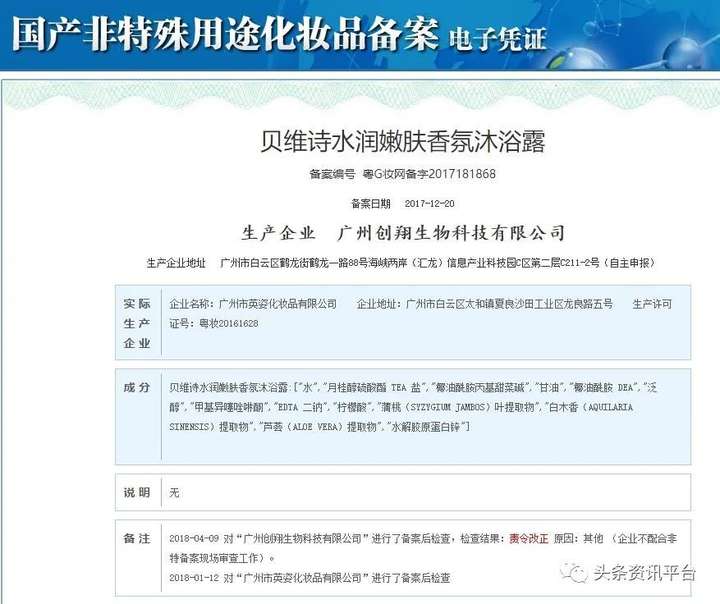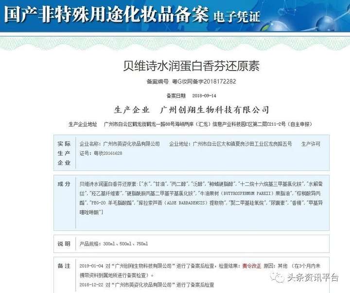 挂着贝维诗牌子的化妆品,除了特殊用途化妆品,还有非特殊用途化妆品。经查国产非特殊用途化妆品备案平台,我们发现广州创翔生物科技有限公司生产的“贝维诗水润蛋白香芬还原素”、“贝维诗弱酸性无硅马油沐浴露”、“贝维诗竹炭控油祛痘洁面乳”等产品都曾因在3个月内未携带资料到属地所进行备案检查遭到过责令改正。