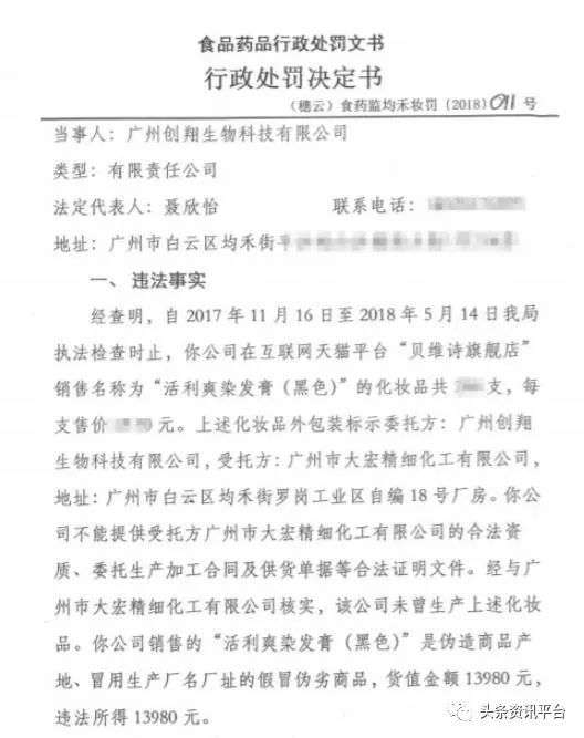 2018年6月,白云食药监发布《行政处罚决定书(穗云)食药监均禾妆罚〔2018〕011号》,对广州创翔生物科技有限公司销售假冒伪劣化妆品的行为进行了处罚,处罚措施为:1、没收违法所得13980元;2、罚款5592元(违法商品货值金额0.4倍);另责令停止销售假冒伪劣化妆品行为,并对所售化妆品自行清查,确保产品合法合格。