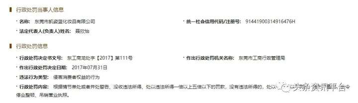 值得一提的是,聂欣怡目前还在东莞市凯姿蓝化妆品有限公司担任法定代表人,而该公司曾因侵害消费者权益的行为遭到过东莞市工商行政管理局的行政处罚。行政处罚内容为根据情节单处或者并处警告、没收违法所得、处以违法所得一倍以上五倍以下的罚款,没有违法所得的,处以一万元以下罚款;情节严重的,责令停业整顿、吊销营业执照。
