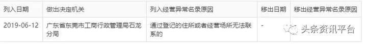 2019年6月,该公司又因通过登记的住所或者经营场所无法联系被广东省东莞市工商行政管理局石龙分局列入经营异常名录,至今未被移除。