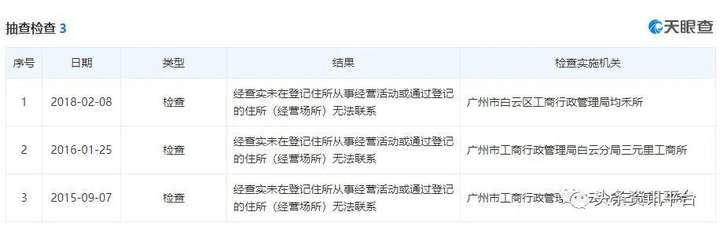 另据天眼查显示,广州市白云区工商行政管理局均禾所、广州市工商行政管理局白云分局三元里工商所等部门在过去的这些年间对创翔公司进行检查时,总是会遇到“经查实未在登记住所从事经营活动或通过登记的住所(经营场所)无法联系”的状况。