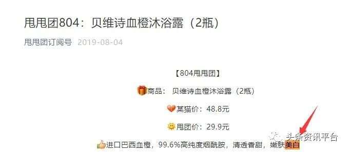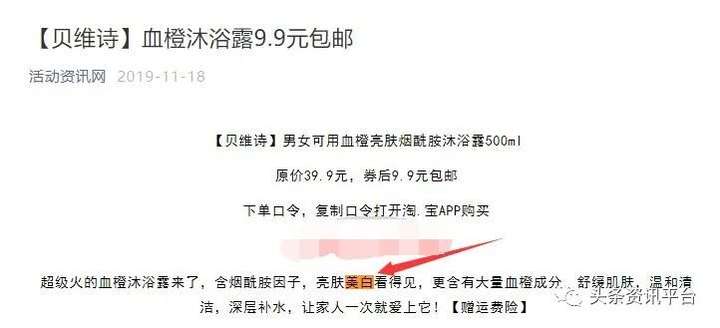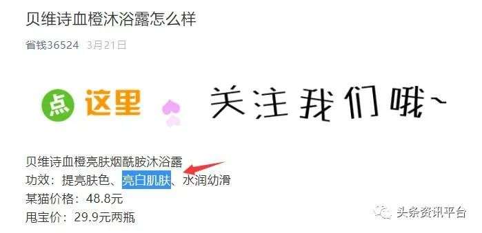 说到关于产品宣传的方面,目前,“省钱36524”、“甩甩团订阅号”、“活动资讯网”、“西瓜小管家”等公众号在对外介绍“贝维诗血橙亮肤烟酰胺沐浴露”时,都明确声称该产品具有美白功效。