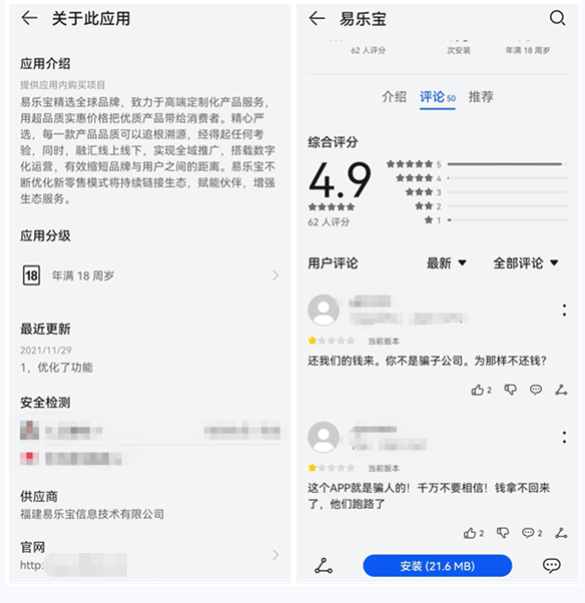 在应用商城里,易乐宝的应用介绍说,易乐宝精选全球品牌,致力于高端定制化产品服务,用超品质实惠价格把优质产品带给消费者,每一款产品品质可以追根溯源,经得起任何考验。而在该APP最新的评价里却是用户反映这款APP是骗人的。