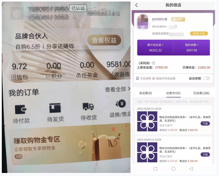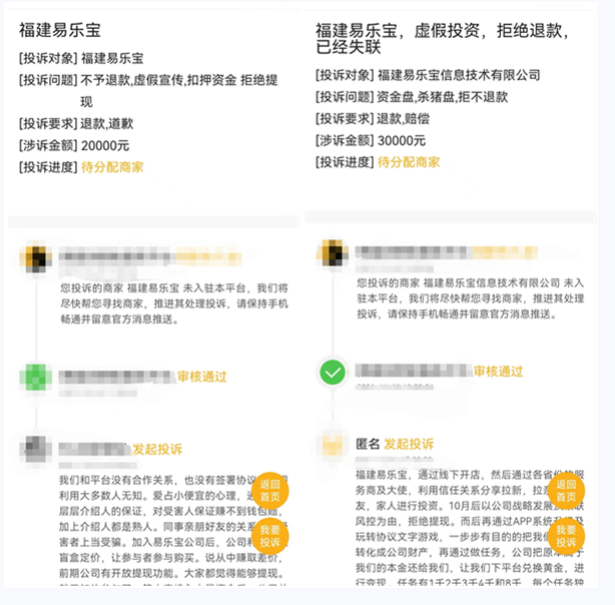 据网友小林反馈说,他是在2021年接触到的易乐宝这家公司,同年9月通过易乐宝APP平台,易乐宝公司组建微信群诱导群里的投资者创业,投入资金开微店,还通过各省份的代理商,利用信任关系分享人头进行投资。9月底就接到了平台提示提现关闭延迟的消息,10月8日恢复提现功能。