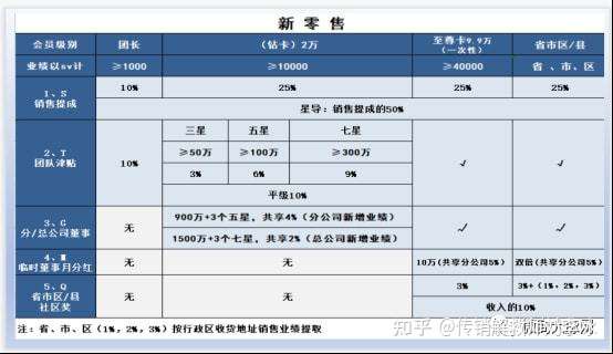 天星国际商城新零售制度设计了会员、初级、中级、高级服务商、市级、省级五层级别,5项大奖(S、T、G、Q、M)通过拉人头方式给予团队多层级计酬奖励。