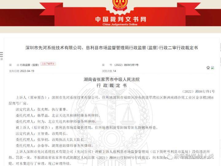 近日,中新融媒在中国裁判文书网发现一则题为《深圳市先河系统技术有限公司、慈利县市场监督管理局行政监察(监察)行政二审行政裁定书》(简称:《二审行政裁定书》)。