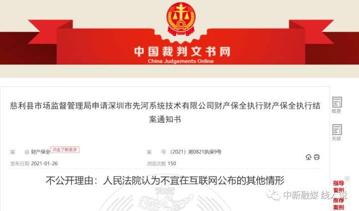 值得注意的是,2021年1月26日,中国裁判文书网发布题为《慈利县市场监督管理局申请深圳市先河系统技术有限公司财产保全执行财产保全执行结案通知书》,但具体显示不能公开,其理由是:人民法院认为不宜在互联网公布的其他情形。
