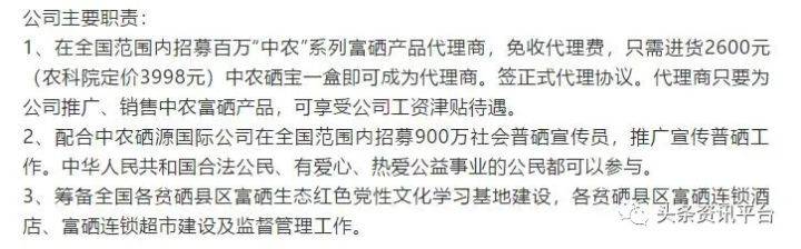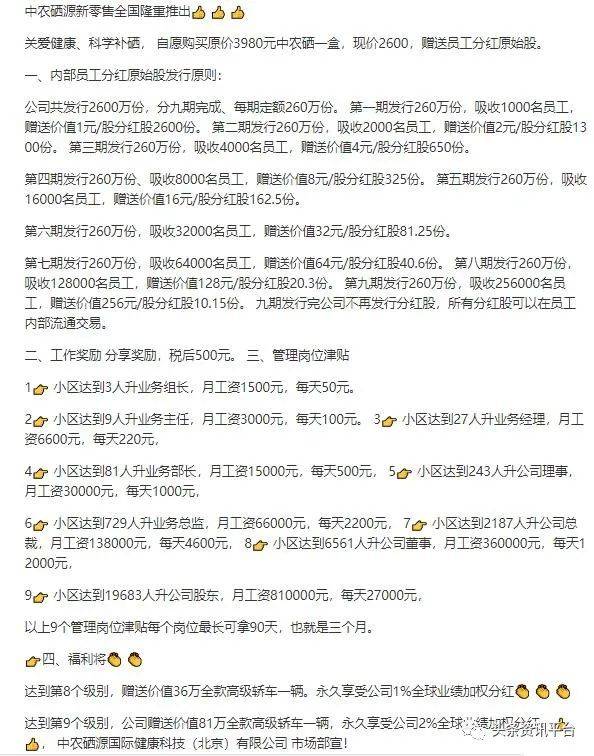了解完中农硒源目前所实行的代理制度和内部分红股政策之后,我们将在下篇报道中继续剖析中农硒源的产品资质以及该公司在产品宣传方面所存在的问题,请继续关注头条资讯平台。