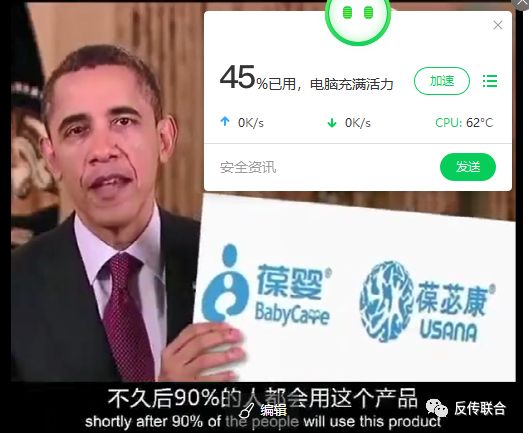 依照惯例,很多美国总统每周都会发表一次演讲,题目各异,不光是奥巴马,小布什、特朗普也都如此。在2021年3月3日的这次演讲中,奥巴马的话题是关于能源控制的议题,所以在演讲中举起了一张关于美国对海外石油依赖性下降的牌子。但是估计他万万没有想到的是,这个图像却被一些别有用心的人盗用了,还把他手里的牌子换成了USANA和葆婴的广告牌。这样的手法虽然拙劣,但是对于那些不懂英语又不了解美国的人来说,依然很容易起到混淆视听的作用。