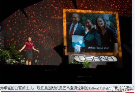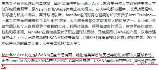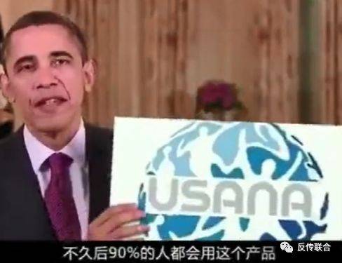 至于那个美国篮球明星Jennifer Azzi,的确是USANA的经销商,并且在USANA的网站上也曾多次出现,但其中没有任何一条与奥巴马有关的报道。倘若此人真的是把奥巴马都给拉进了USANA的朋友圈,USANA还能不疯狂吹捧她的这个丰功伟绩吗?这个Jennifer Azzi也曾到访白宫,受到奥巴马的接见并与其合影,丝毫不足为奇。但奥巴马身为美国总统,衣食住行都受到严密的保护,岂能轻易听从一个外人的建议就随随便便乱吃东西?美国保健品的品牌成千上万,USANA在美国的保健品行业根本就是一个名不见经传的货色,就算奥巴马真需要服用保健品,也轮不到USANA。否则,USANA的网站上早就挤满了奥巴马服用其产品的广告了。在美国,如果USANA胆敢利用奥巴马的名义虚假宣传,马上就会被监管机构盯上,分分钟罚到死。所以,借它十个胆子,也不敢无中生有。但是在国外,摆脱了美国法律的管辖,这种事情就不新鲜了。在中国某些网站上,便流传着这样的影像: