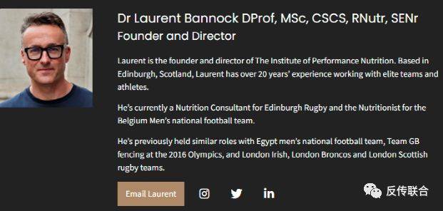 班奈克全名Laurent Bannock(Laz Bannock是简写),目前的职务是英国运动能营养学院(Institute of Performance Nutrition,简称IOPN)的院长。该学院的主页上有他的履历: