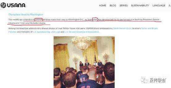 美国人对体育普遍热情高涨,总统接见体育明星实属家常便饭。USANA作为一家保健品企业,赞助体育明星也属常规操作。但是美国东奥代表团有200多人,接受USANA赞助的不过区区数人而已。按照USANA自己的说法,也不过就是a handful of USANA athletes,意思是USANA赞助的运动员一只手就能数得过来。真正列出姓名来的其实只有三个人,另外还有美国速度滑冰协会、美国无舵雪橇协会和美国滑雪和单板滑雪协会三个体育机构,但并不是这些机构所属的运动员接受了USANA的赞助。在这篇USANA的官方新闻里还耍了一个花招,在英语中美国队叫做Team USA,而USANA的前三个字母也是USA,于是USANA故意把USANA Athletes和Team USA混在一起,不知情的人很容易误以为美国队全都是USANA赞助的,甚至把Team USA直接当成Team USANA。