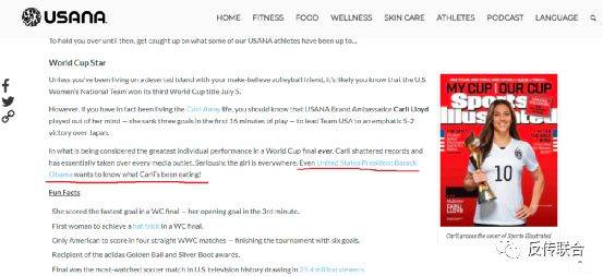 在USANA公司的主页上,以“奥巴马(Obama)”为关键词搜索相关新闻,结果只有区区七条而已,其中真正提到奥巴马本人的只有两条,一个是2014年3月在索契冬奥会结束之后,当时的美国冬季奥运会代表团应邀访问白宫,受到了时任总统奥巴马夫妇的接见。在这个代表团中,有几个运动员是USANA赞助的。另一个是2015年美国女子足球队夺取了女足世界杯冠军,其中一名队员卡莉·劳埃德(Carli Lloyd)在决赛中打进了三个球,而此人也是USANA赞助的,还有一个USANA品牌大使(USANA Brand Ambassador)的头衔。根据USANA的说法,连奥巴马都感兴趣究竟此人吃了什么东西才能有那么好的体力。