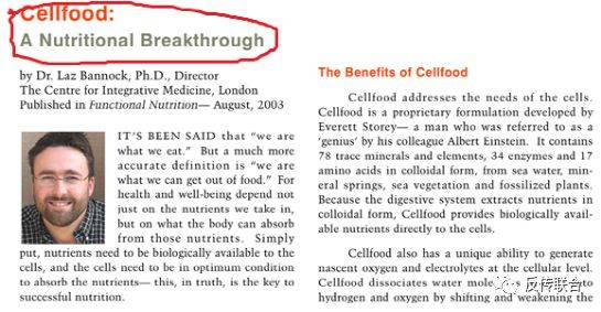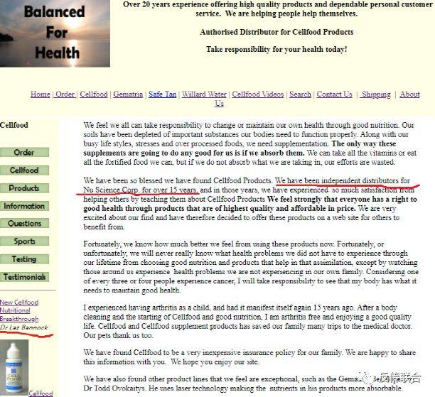 A Nutritional Breakthrough, 翻译成中文应该是“营养学的突破”,作者是Dr. Laz Bannock,似乎和葆婴的宣传单都能对得上。等等,最上面那个Cellfood是什么?链接这篇文章的这个网站的简介里面写着,这是一家为Nu Science Corp担任经销商已经长达15年的公司,那么Nu Science Corp又是什么?和USANA有关系吗?