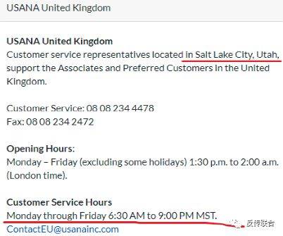 虽然USANA产品在1998年就进入了英国市场,但是USANA公司在英国根本连一个办事处都没有。在USANA的主页上显示,英国的客户和经销商如果遇到任何问题,只能联系位于USANA美国盐湖城总部的客服人员,而且还只能在美国中部山地时间(MST)周一到周五早上6:30到晚上9:00(相当于英国时间下午1:30到凌晨4:00),过时不候。