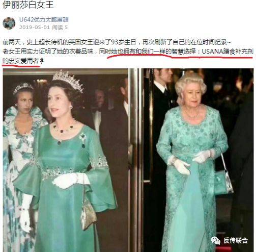 看来还是葆婴厉害,一个和英国皇室八竿子打不着的营养师写的一篇为USANA竞争对手唱赞歌的文章,居然能被葆婴拿来把USANA吹嘘成英国皇室的“御用”保健品,这天马行空的想象力,就算是庞氏骗局的创始人只怕也要甘拜下风。当然这些无中生有的东西断然不能用英文写,否则一旦被发现,会被人家控告,到时候会被罚得连底裤不剩,所以只能用人家看不懂的中文来写,忽悠中国人。