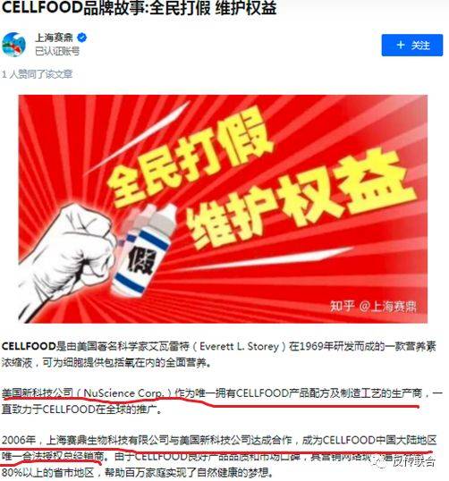 Nu Science Corp, 中文译名是“新科技公司”,是一家美国的保健品制造企业。Cellfood翻译成中文可以叫做“细胞食品”,正是这家公司的主打营养保健食品,在中国大陆地区由上海赛鼎生物科技有限公司负责经销。众所周知,USANA也是一家号称生产“细胞营养素”的企业,和这个Cellfood正好是竞争对手啊。