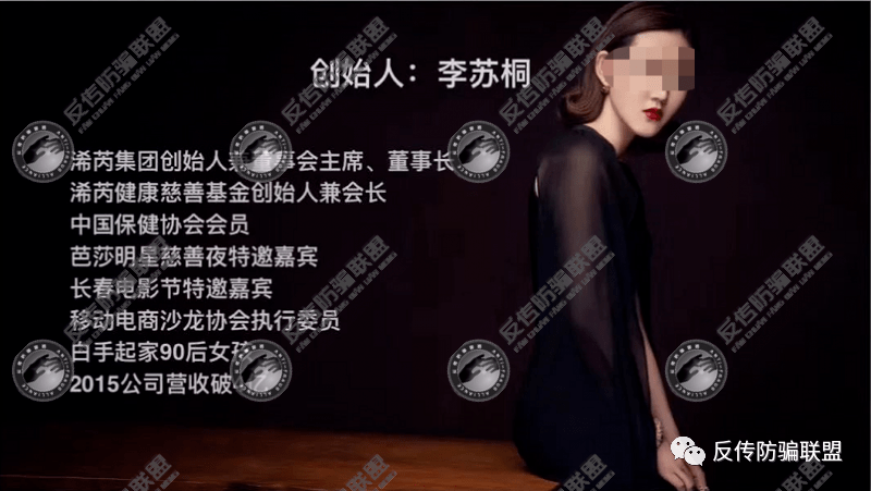 据燕教授宣传资料显示,李苏桐头衔众多:浠芮集团创始人兼董事会主席、董事长,浠芮健康慈善基金创始人兼会长,中国保健协会会员,芭莎明星慈善夜特邀嘉宾,长春电影节特邀嘉宾,移动电商沙龙协会执行委员,白手起家90后女孩,2015年公司营收破4亿......
