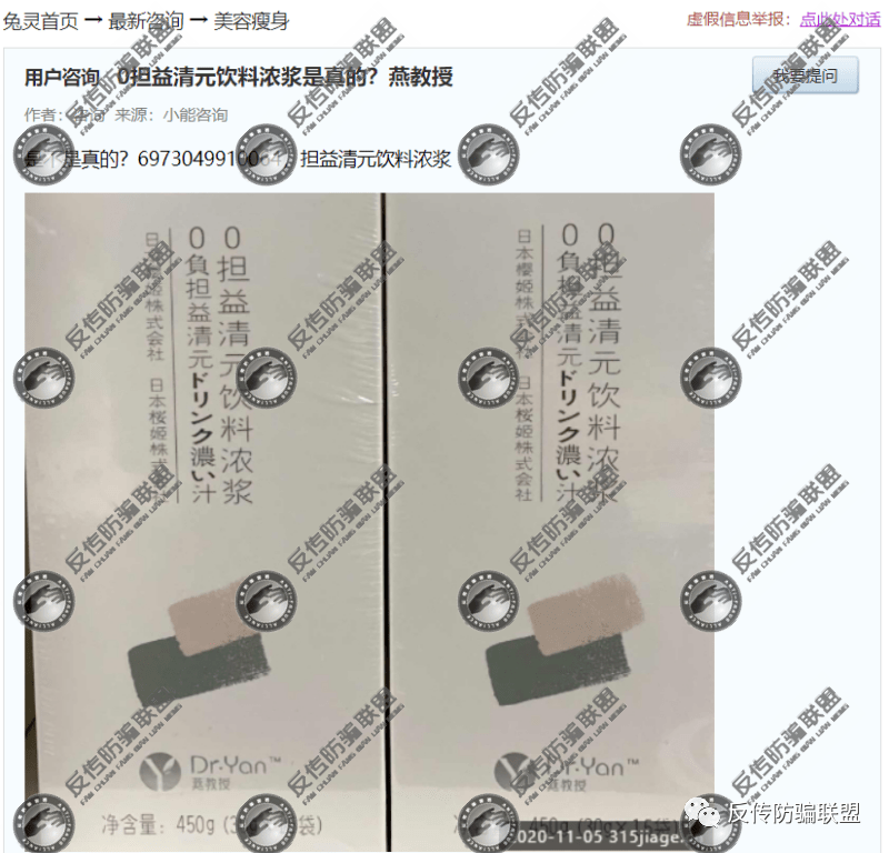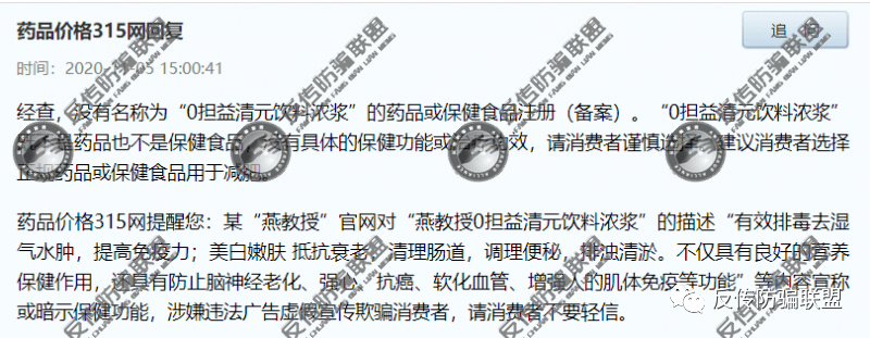 对此,药品价格315网回复道 “经查,没有名称为“0担益清元饮料浓浆”的药品或保健食品注册(备案)。“0担益清元饮料浓浆”既不是药品也不是保健食品,没有具体的保健功能或治疗功效,请消费者谨慎选择。建议消费者选择正规药品或保健食品用于减肥。