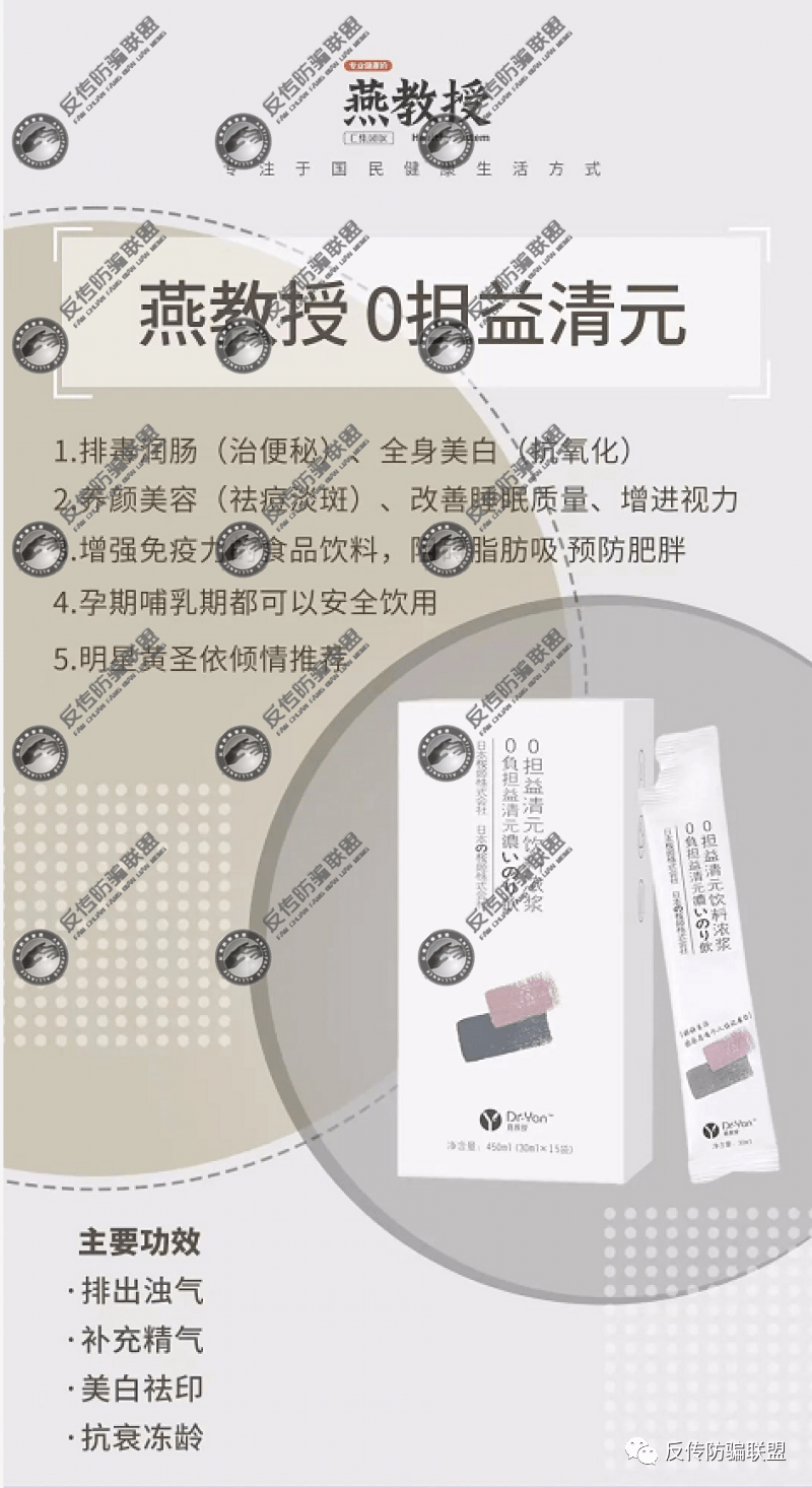 据推广人员提供的宣传资料显示,一款名为“燕教授0担益清元饮料浓浆”的产品宣称可以治便秘、抗氧化、祛痘淡斑、增进视力、预防肥胖、抗衰冻龄等多种功效。