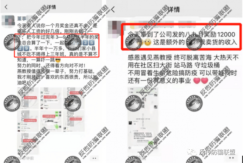 反传防骗联盟留意到,不少燕教授代理在其朋友圈发文炫耀自己的奖金,一位代理称自己在燕教授仅半年就拿到了11万多奖金,而另一位代理也称自己两个月奖金12000元,还不算卖货的收入。