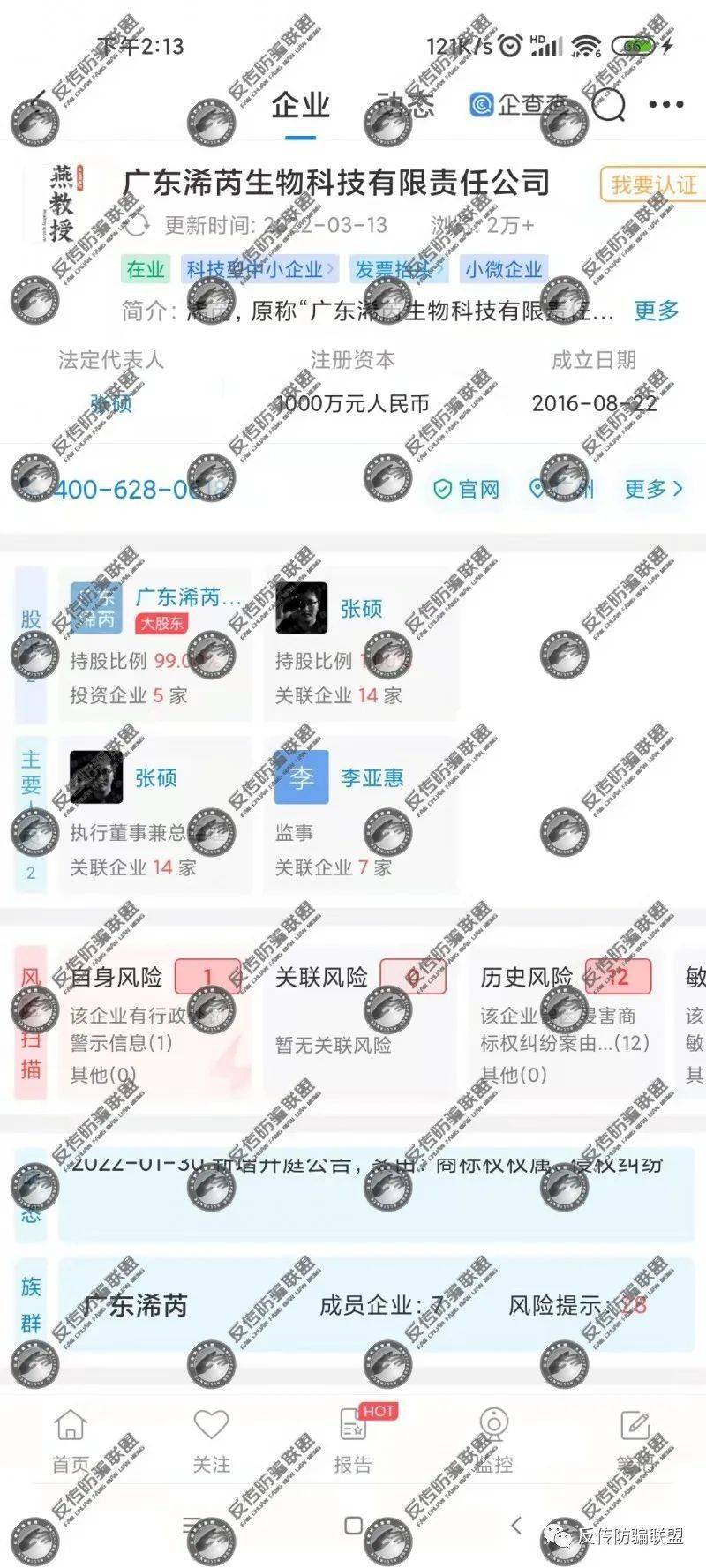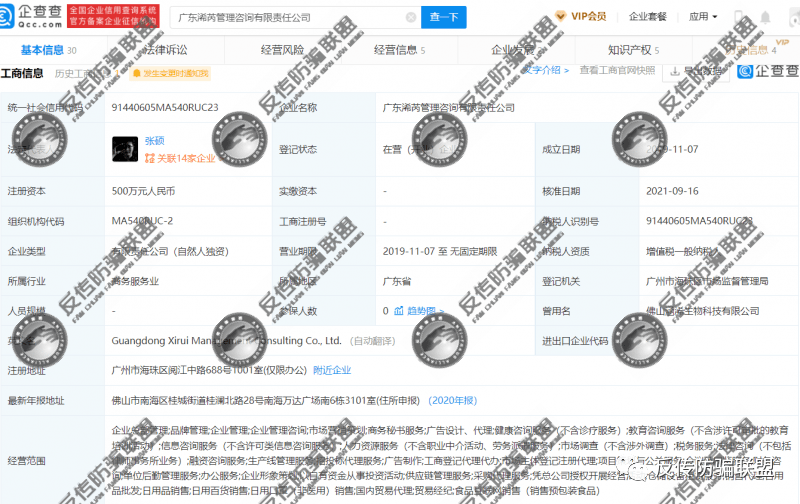 反传防骗联盟查询到,广东浠芮生物公司的最大股东广东浠芮管理咨询有限责任公司成立于2019年11月7日, 原名为佛山涵浠生物科技有限公司,注册资本500万,法人代表依然是张硕,李亚惠持股100%,为最终受益人。