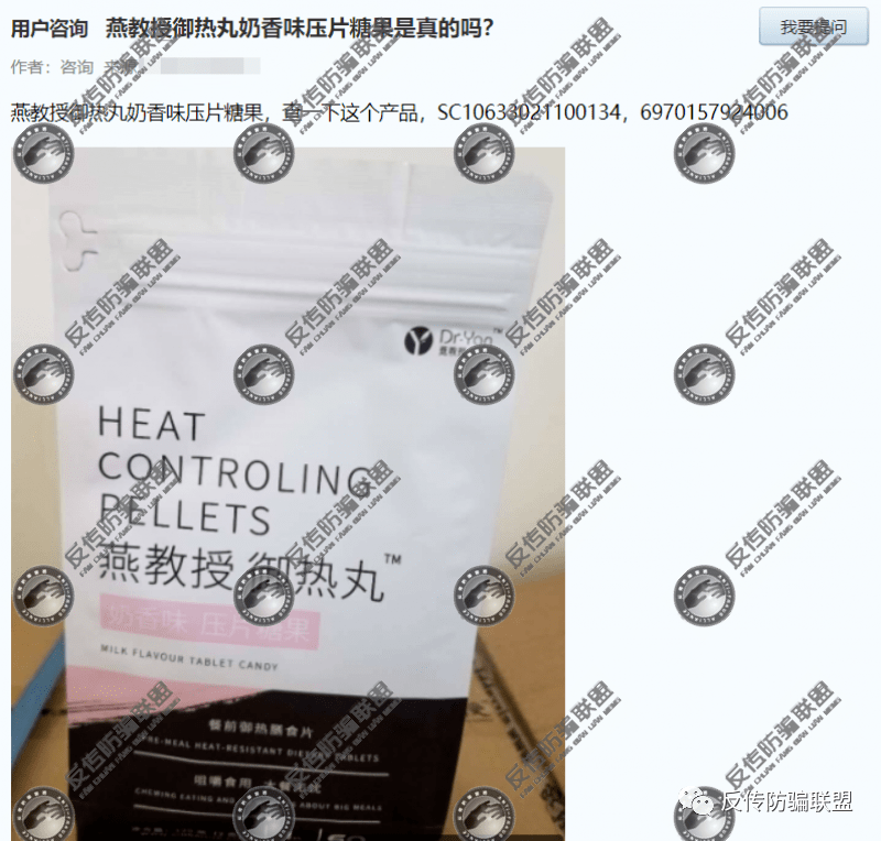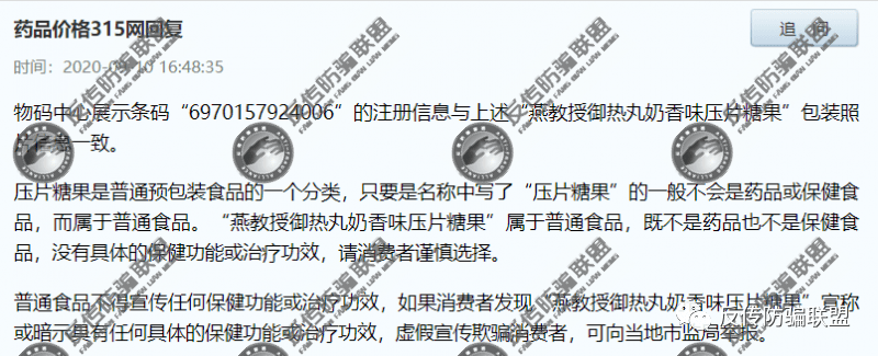 2020年,在药品价格315网,同样有用户询问“燕教授御热丸奶香味压片糖果是不是真的?”而药品价格315网给出了与“0担益清元”同样的回复: