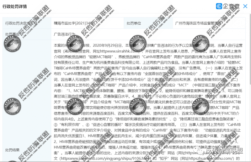 据处罚决定书显示,燕教授官网发布的两款普通食品的宣传广告存在使用涉及疾病治疗功能的宣传用语的违法行为:一、“轻燃MCT咖啡”产品页面的宣传广告中含有“降低组织和器官中胰岛素的抗性”、“降低高甘油三酯血症患者血脂浓度”、“有利尿作用”、“促进心血管的循环”等涉及疾病治疗功能的宣传用语;二、“CaHMB营养曲奇”产品页面的宣传广告中含有“促进肌肉生长,减少肌肉蛋白质消耗,有助肌肉恢复”;“维持胰岛素功能、调节血糖平衡”等涉及疾病治疗功能的宣传用语。当事人的上述行为违反了《广告法》第十七条的规定,广州市海珠区市场监督管理局已根据《广告法》第五十八条第一款第二项的规定,对当事人做出行政处罚。