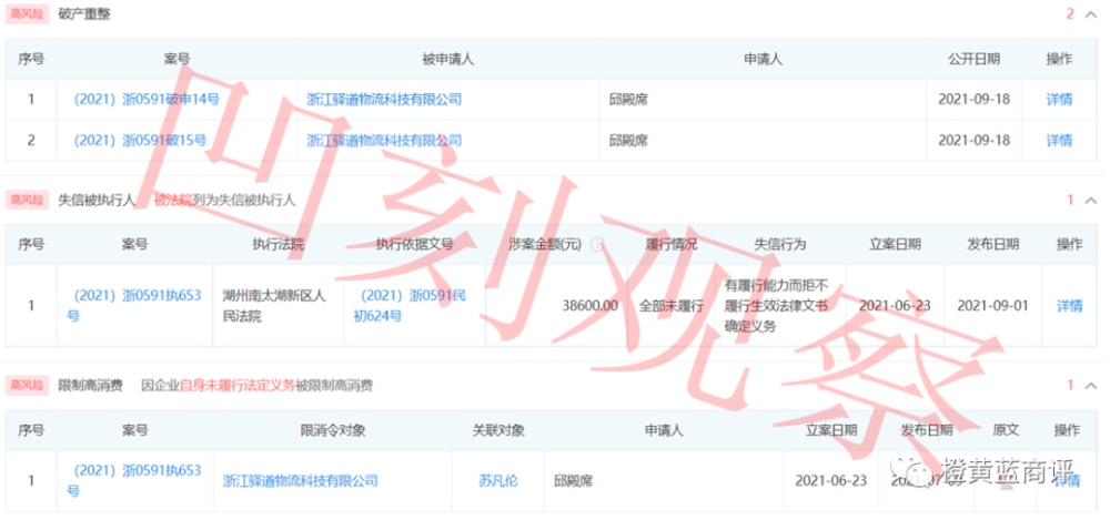 通过信息中国公式,凹刻观察发现浙江驿道物流科技有限公司有多起高风险提示,如破产重整、失信被执行人,被法院列为失信被执行人限制高消费等多种处罚。