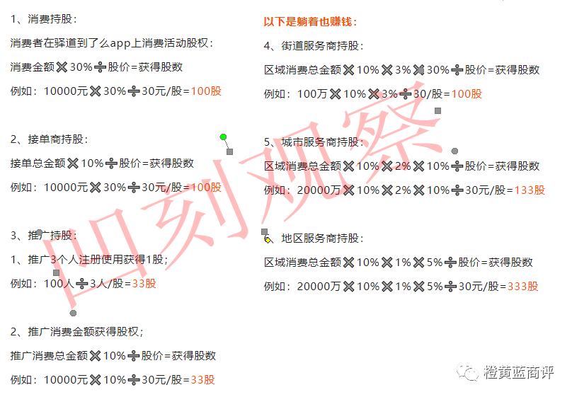 为了诱使更多的人员参与,驿道物流还推出消费持股,接单商持股,推广持股与街道服务商持股,城市服务商持股地区服务商持股的各种不同能的花样,各种手段层出不穷。