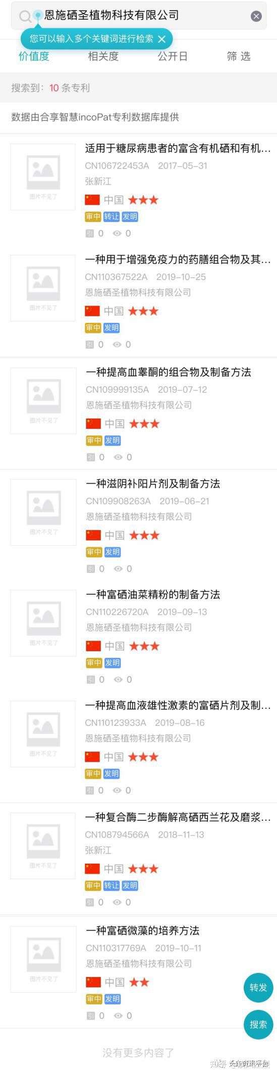 而作为恩施硒都龙涎科技有限公司产品生产商的恩施硒圣植物有限公司,我们经过查询发现该公司一共有八项专利,这八项专利同样处于审查中,暂未获得授权,并且大部分的专利都是一些提高免疫力、培养富硒植物等内容,并没有出现前文宣传的可以治病的描述。