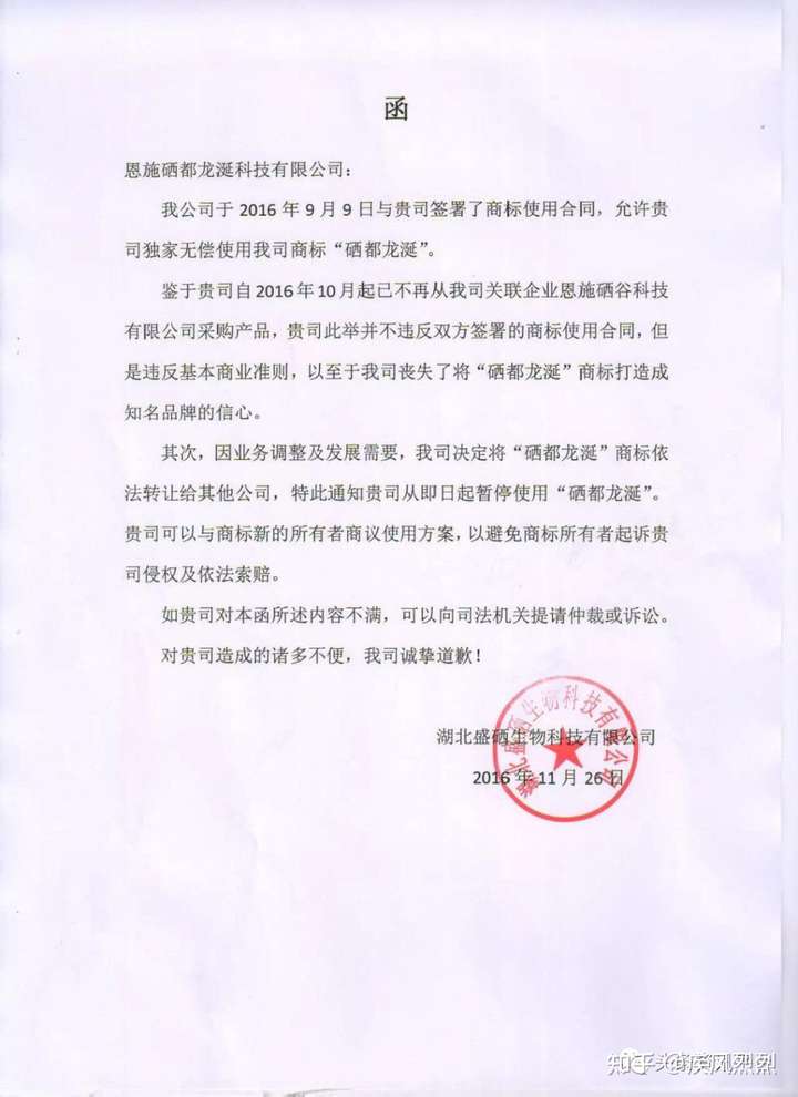 据《关于商标“硒都龙涎”的公告 》显示,同年9月,恩施硒都龙涎科技有限公司在未做出任何通知与协商的情况下,通过其他公司采购了与恩施硒谷科技有限公司生产的硒蛋白片相仿的产品销售,两家公司出现分歧,而硒都龙涎公司对于此行为没有做出任何解释。于是,在2016年11月26日,恩施盛硒生物科技有限公司向恩施硒都龙涎科技有限公司发函,宣布终止“硒都龙涎”的商标使用。