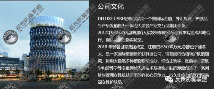 据轻奢世家宣传资料显示,轻奢世家是一个集国际金融、外汇投资、护肤品生产研发销售为一体的大型多产业交互型集团企业。2017年轻奢世家品牌创始人梁姣与加拿大皇家科学院达成战略合作,创建品蓝生物实验室。2018 年轻奢世家集团成立,注册资本5000万元,总部位于加拿大,是一家国际型创新护肤科技公司。