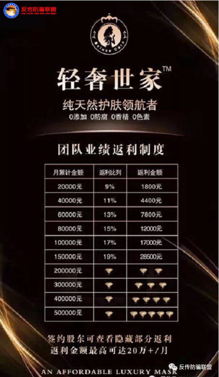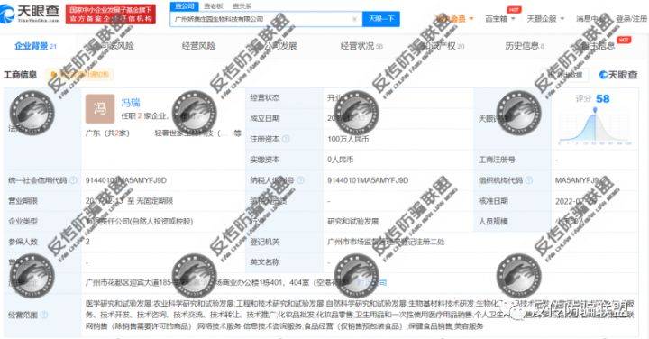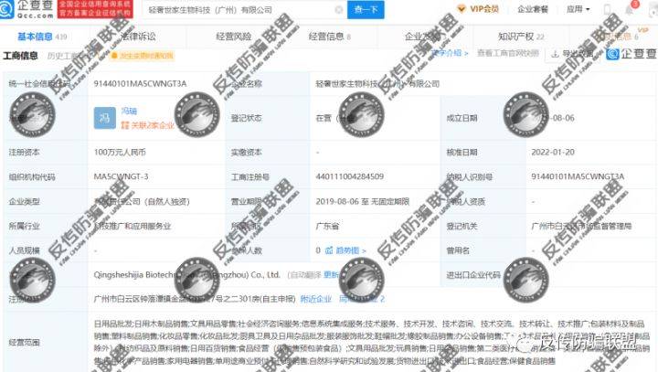 经反传防骗联盟查询,轻奢世家生物科技(广州)有限公司成立于2019年8月6日,位于广州市白云区钟落潭镇金盆南路127号之二301房(自主申报),注册资本100万,实缴0元,法人代表同样是冯瑞。
