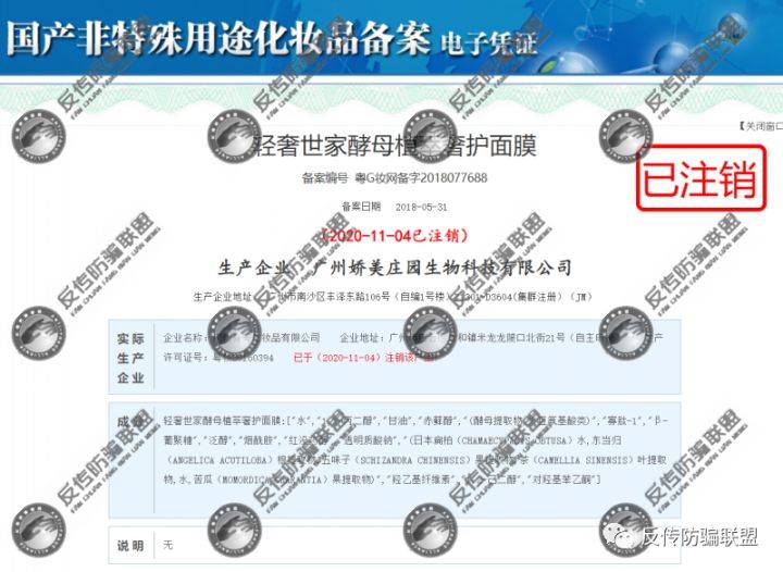 但据反传防骗联盟查询,酵母植萃奢护面膜的备案编号为2018077688,酵母植萃奢护面膜为国产非特殊用途化妆品,而美白淡斑的功能,无疑属于特殊用途化妆品才能够宣传,因而,上述宣传显然属于虚假宣传。更重要的是,如今代理商们仍在宣传推广的三款面膜却早已于2020年11月被注销。